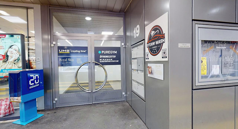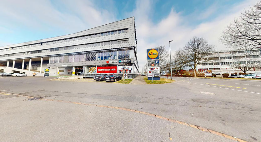 Autobus: Scendere alla fermata Cham, Riedstrasse. L’edificio si trova direttamente alla fermata dell’autobus, a sinistra dell’autolavaggio e sopra il Lidl.